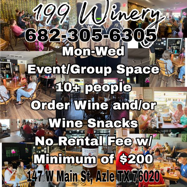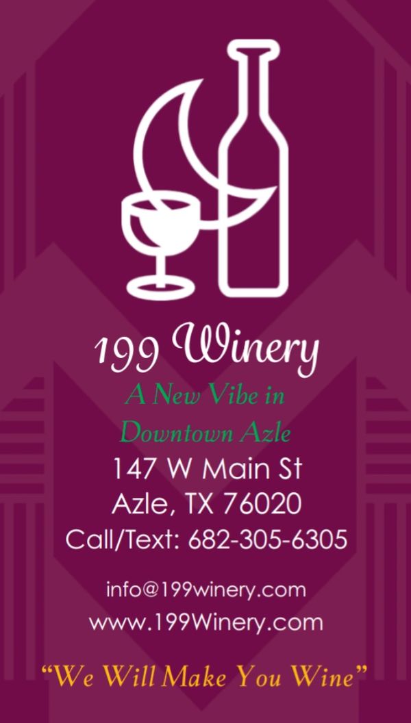 We make our wine in the heart of Azle's vibrant Downtown Main Street, 199 WINERY extends an irresistible invitation to immerse yourself in a sensory adventure that celebrates the art of winemaking. This cozy venue invites guests to explore a world of flavors with handcrafted Sweets, Reds, and Whites tailored to tantalize every palate. Whether gathering with friends or seeking a cozy retreat for intimate gatherings, 199 WINERY delivers an unforgettable experience with warm hospitality and a delicious wine. JOIN OUR LOYALTY PROGRAM WITH QR CODE IN GALLERY!